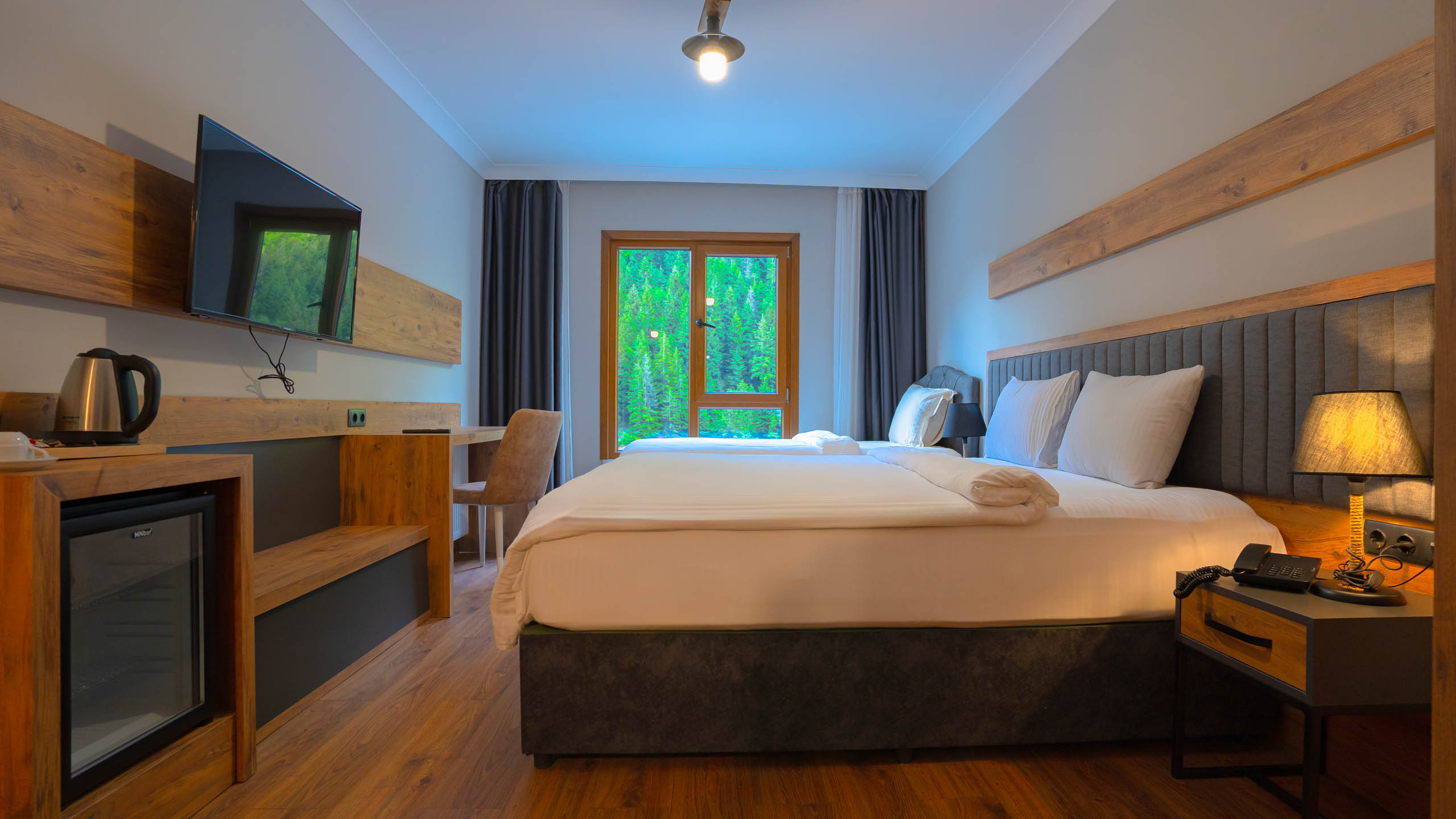 Pazarcık Mountain Hotel olarak size evinizin rahatlığında doğa ile iç içe bir yaşam sunuyoruz. Odalarımız 51m² olup 1+1 ve balkonlu kullanım alanına sahiptir. Tüm odalarımız göl manzaralıdır.